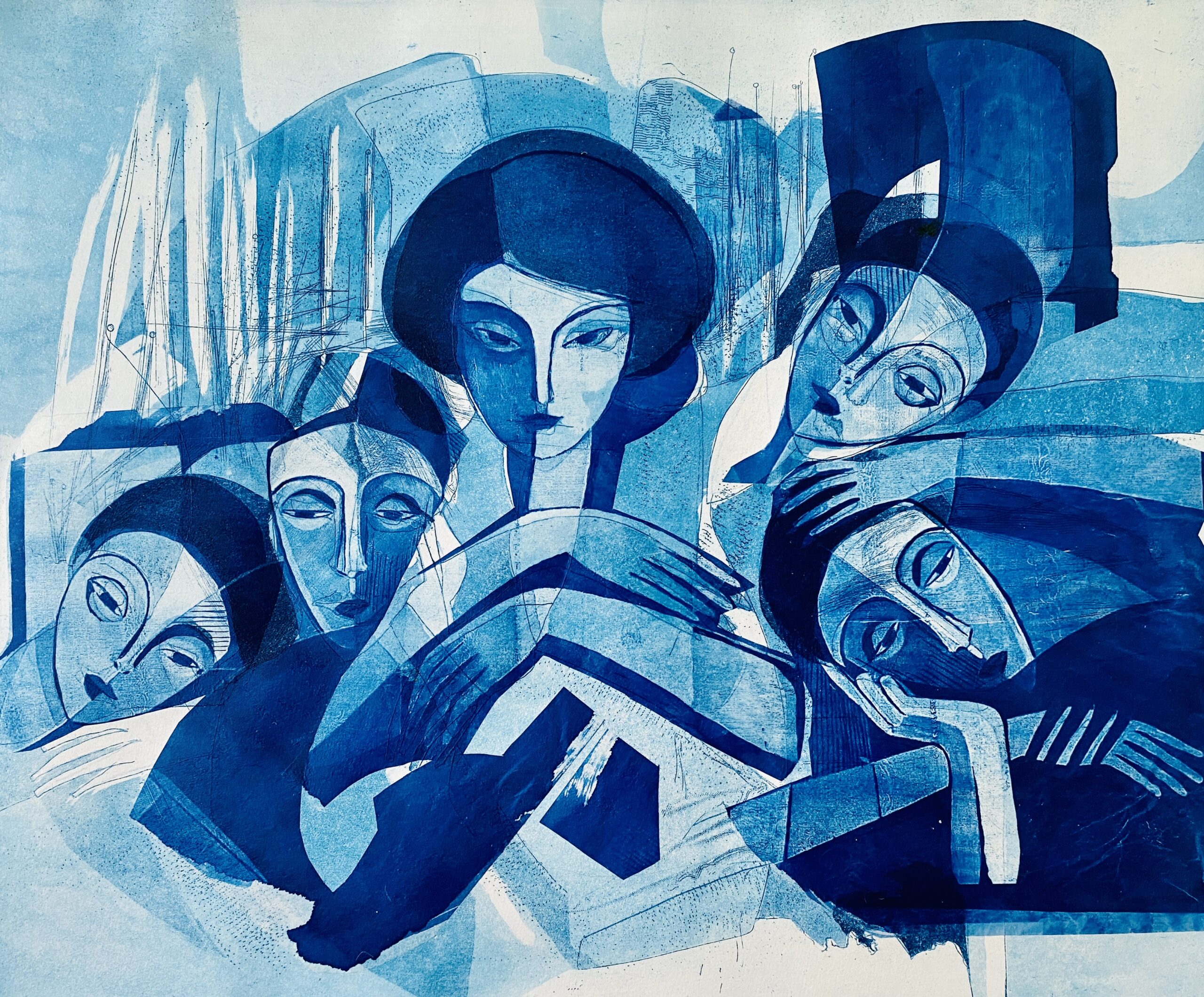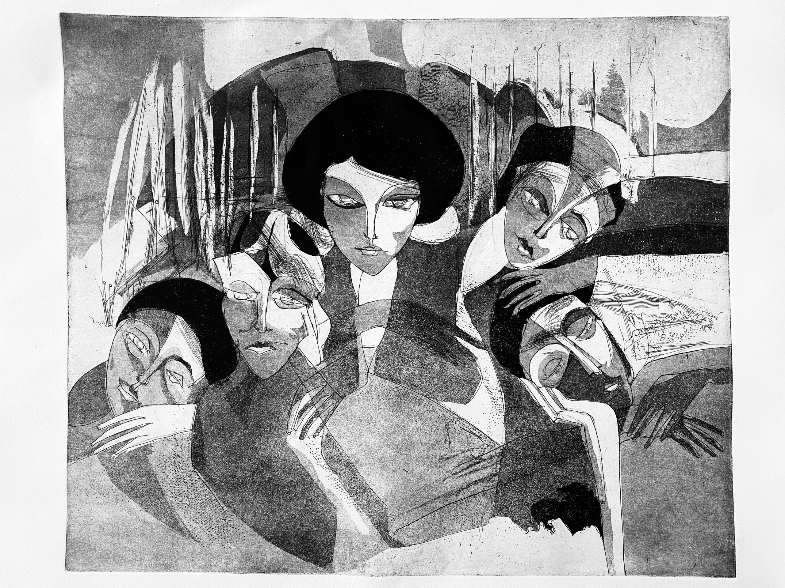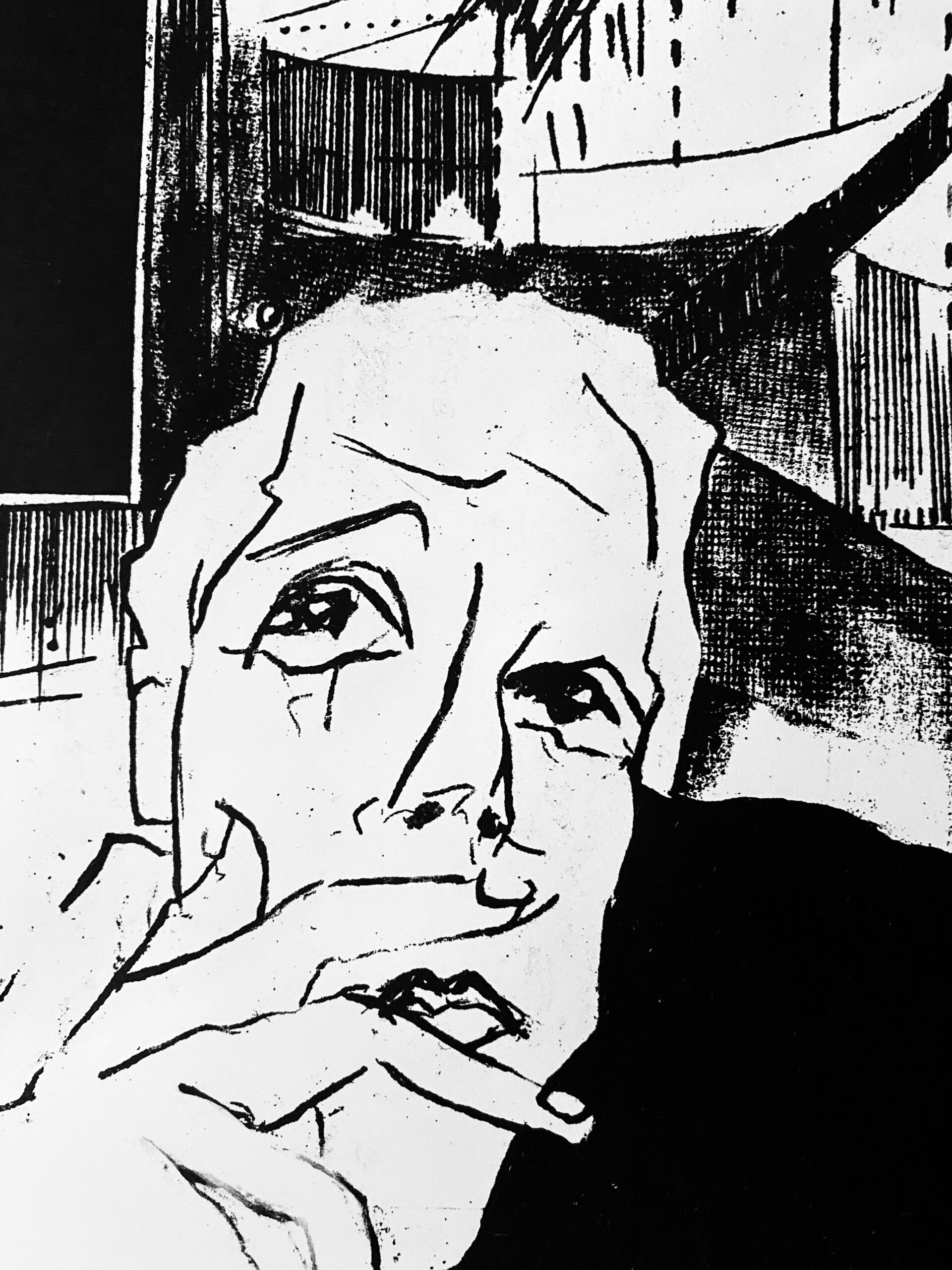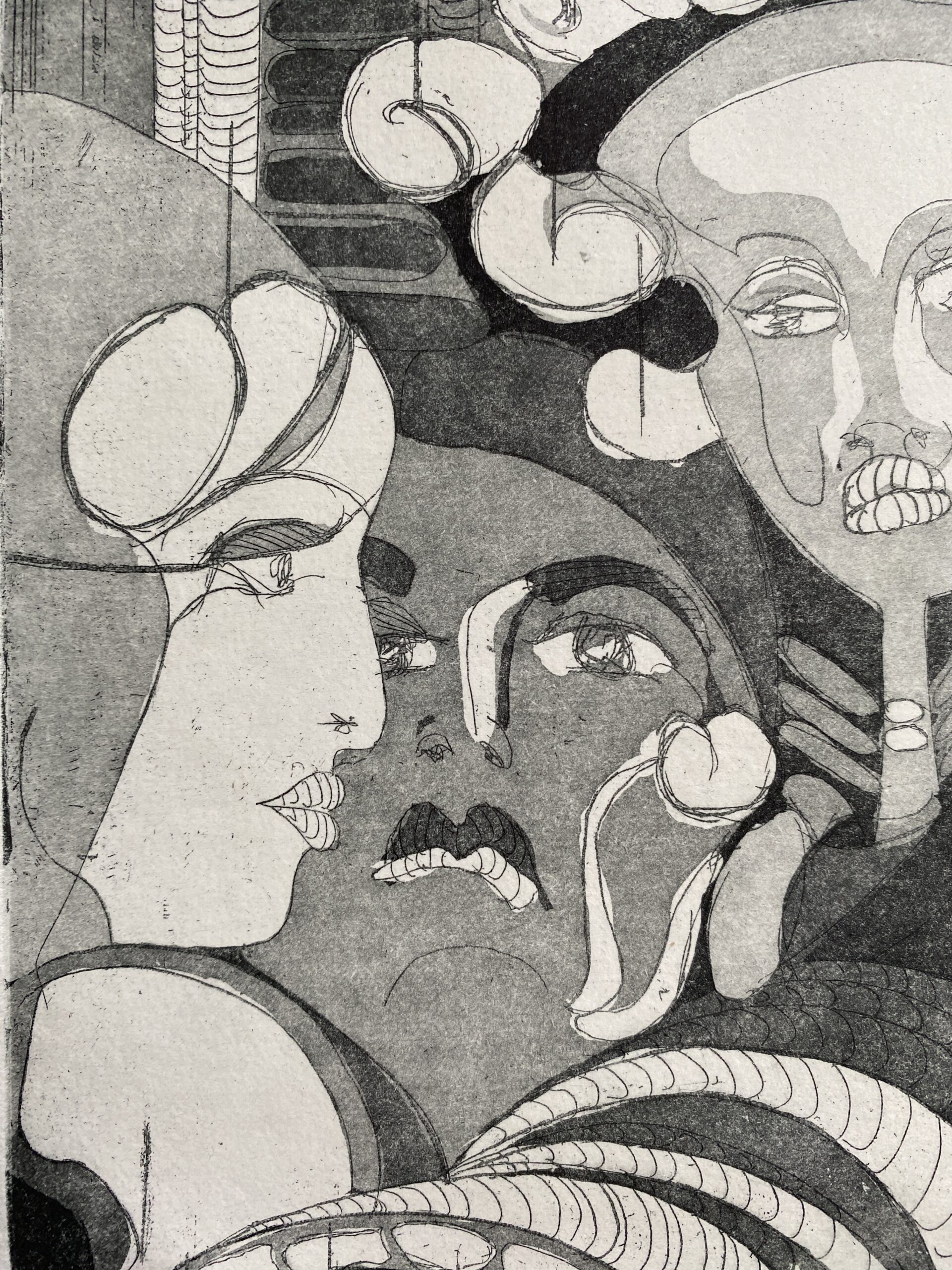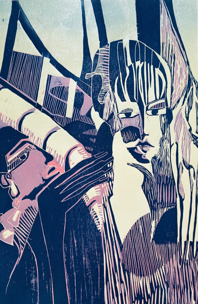 In der Druckgrafik wechseln sich kraftvolle Linien und Flächen in kontrastreichen dynamischen und erhabenen stillen Bildstellen ab. Die Technik transportiert die erzählten Geschichten der Charaktere in einer besonderen Formsprache.